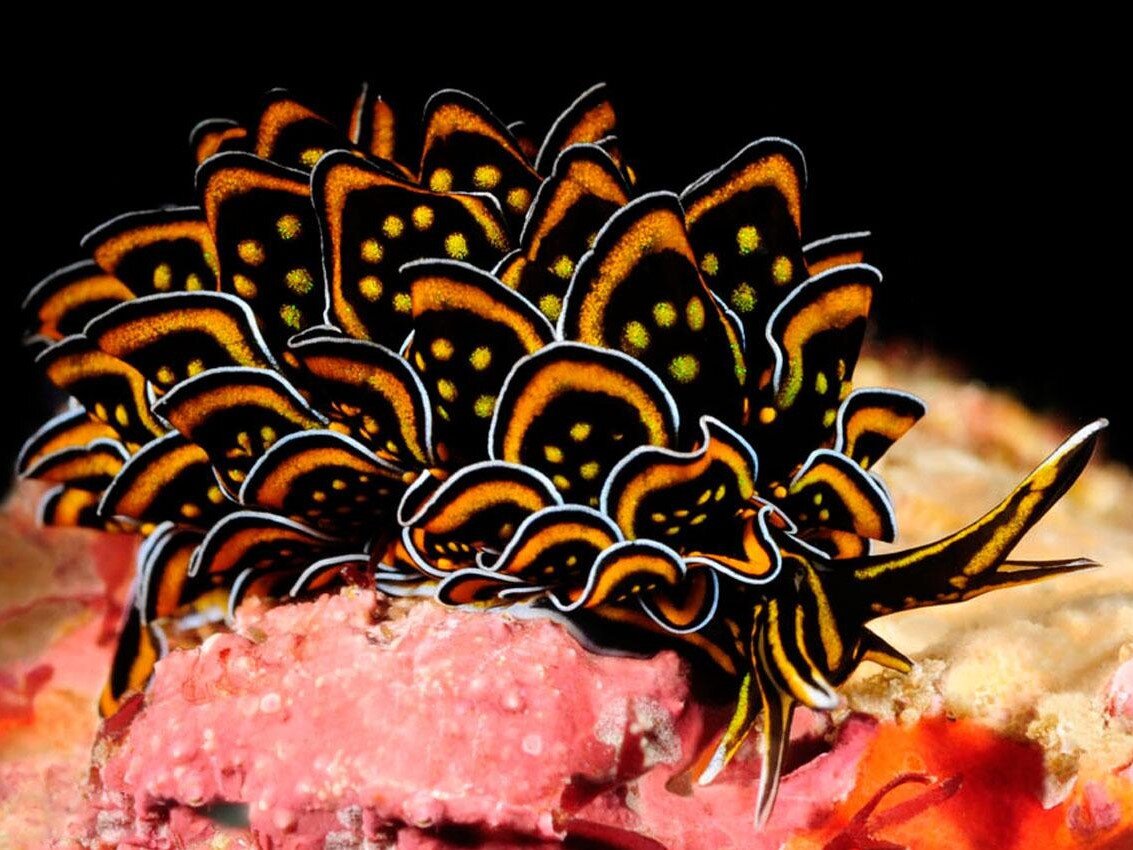 Когда-то давно, говорят, около 250 миллионов лет назад, у морских слизней была раковина, которую они утратили в процессе эволюции. Ну и правильно - зачем же такую красоту раковиной скрывать?☺