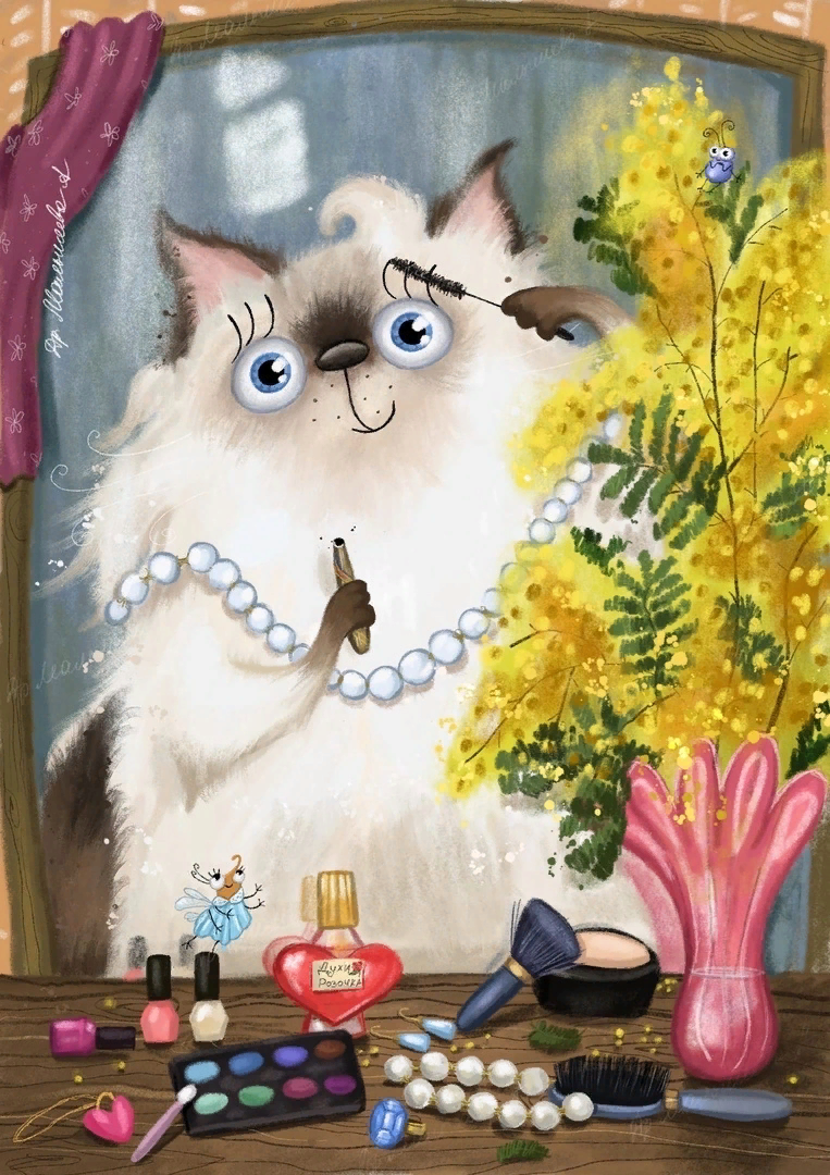Ну а эта кокетка, наводящая красоту, и вовсе близка каждой представительнице прекрасного пола. Только тут я заметила одну маленькую ошибку: женщины, когда красят ресницы, обычно делают это с открытым ртом. Не знаю почему, но это факт. Себя сколько раз ловила на этом.