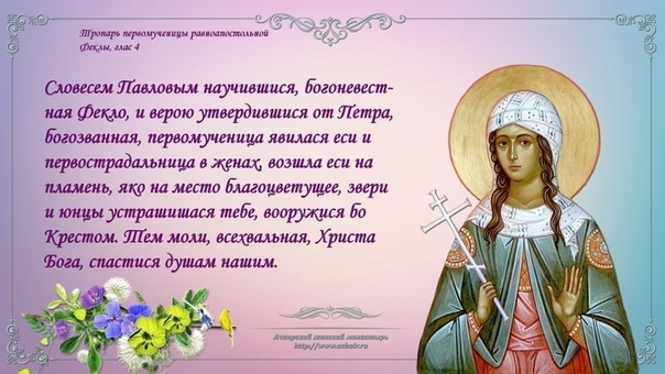 Верующие вспоминают первомученицу Фёклу Иконийскую, раннехристианскую святую, почитаемую в лике равноапостольной.