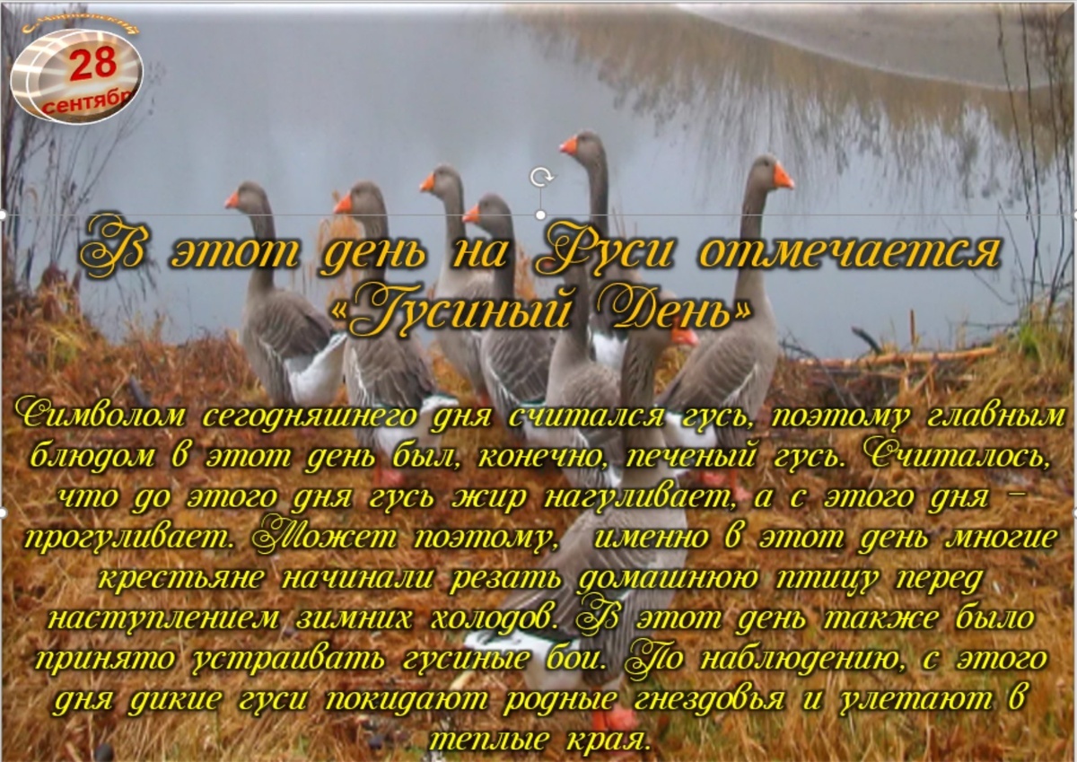 Сегодняшний день это «День Гусиных предсказаний». В этот день говорили: «Гуси летят — зимушку на хвосте тащат, снег несут», — и делали различные предсказания, наблюдая за полетом птиц. Если гуси летели высоко — это предвещало высокое половодье весной.