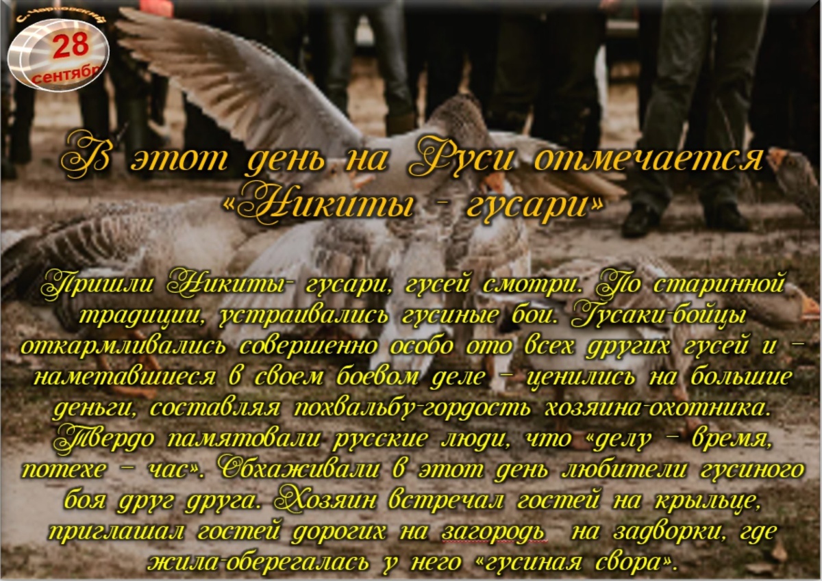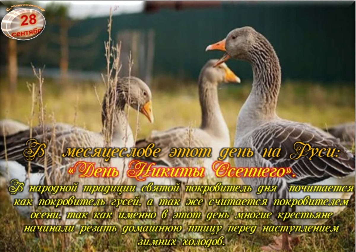 А ещё этот день называли «Праздником охотников на диких гусей». Считалось, что на Никиту Осеннего гуси набирают максимальный вес, а значит, их мясо имеет прекрасный вкус.