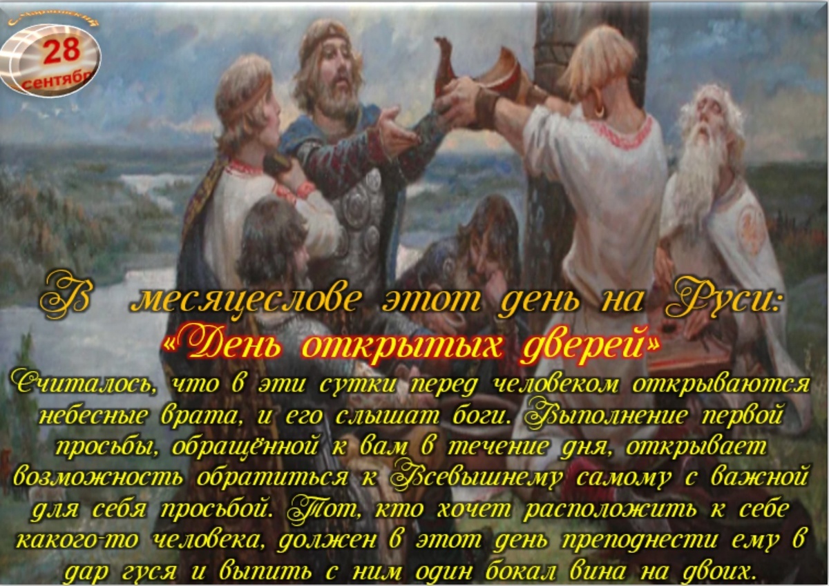 Сегодня: «День постижения себя и мира» или как ещё его называли «День открытых дверей». Считалось, что в эти сутки перед человеком открываются небесные врата, и его слышат боги. Выполнение первой просьбы, обращённой к вам в течение дня, открывает возможность обратиться к Всевышнему самому с важной для себя просьбой. Тот, кто хочет расположить к себе какого-то человека, должен в этот день преподнести ему в дар гуся и выпить с ним один бокал вина на двоих.